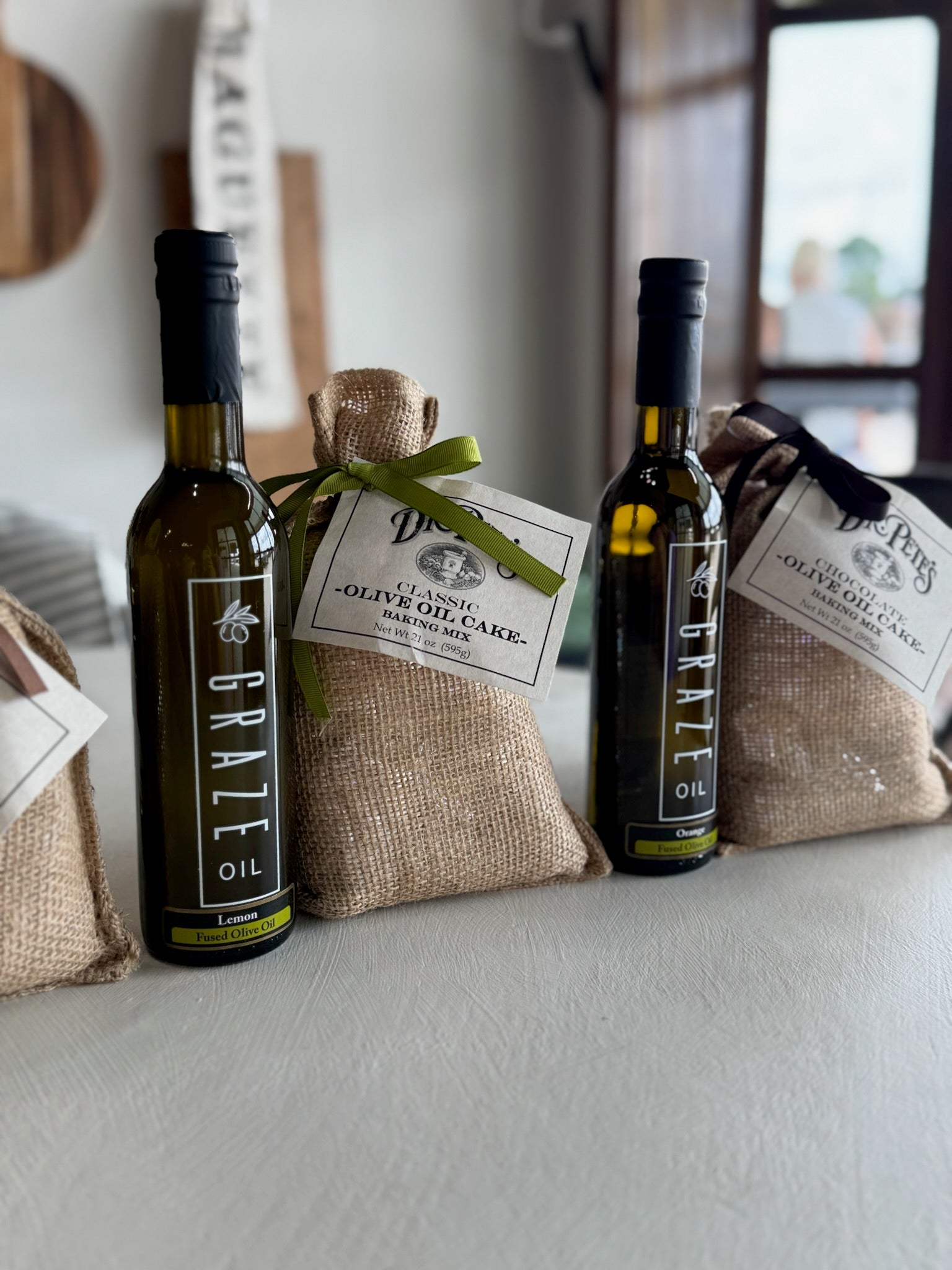 Indulge in the richness of our Chocolate Olive Oil Cake Kit, featuring Dr. Pete’s ultra-moist cake mix paired with Graze Oil Orange Infused Extra Virgin Olive Oil. Wrapped in burlap and boxed in our signature kraft packaging, this artisan cake kit is a celebration of bold flavor and effortless elegance.